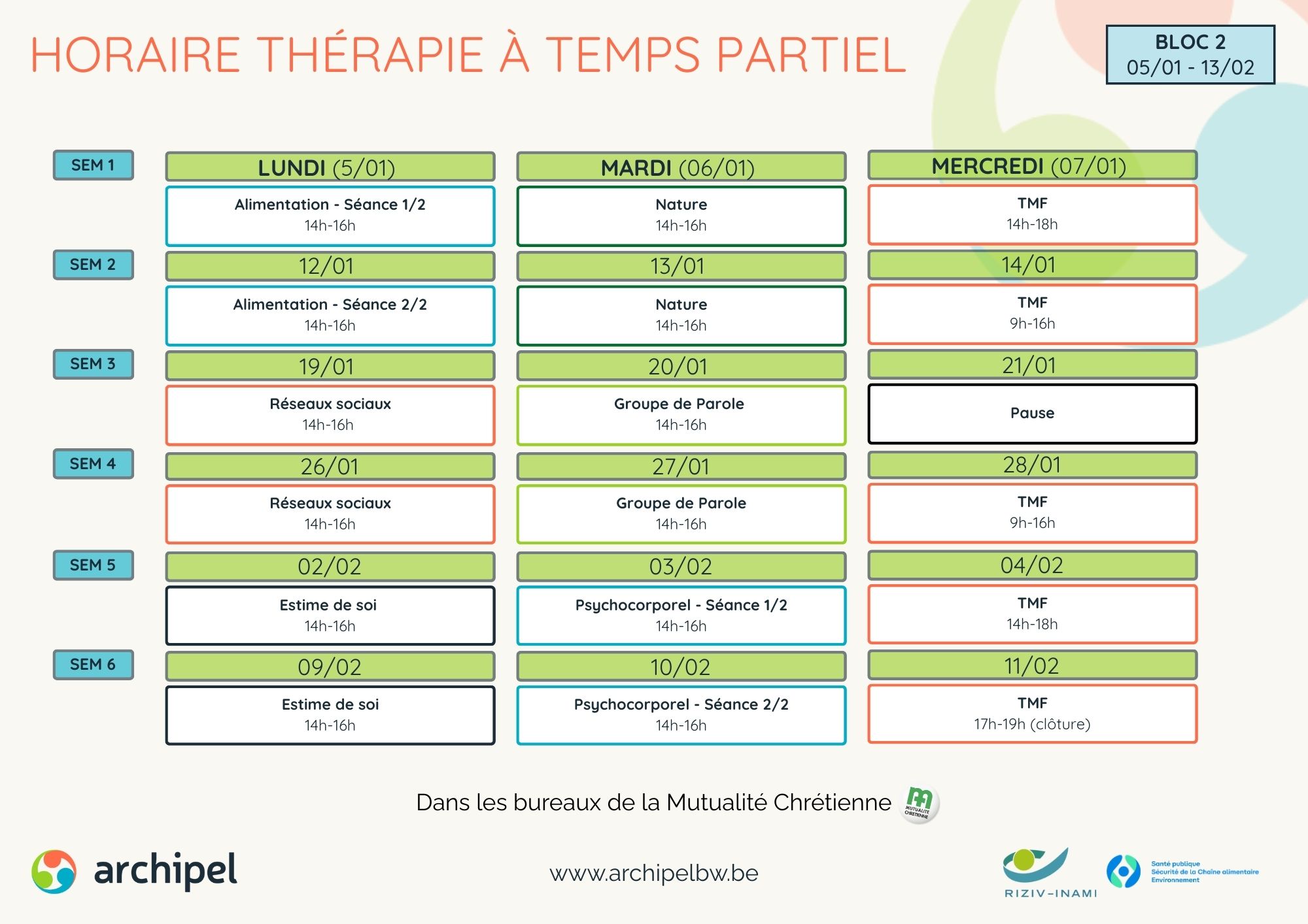 Les modules thérapeutiques et les TMFs sont proposés par blocs d’environ 7 semaines, suivant le calendrier scolaire. A chaque bloc, une nouvelle TMF (accueillant de nouvelles familles) et un nouveau cycle de modules commencent. La TMF sera proposée 1 fois par semaine (4 après-midi de 4h et 1 journée entière, sur 7 semaines) et les modules seront proposés 3 à 4 jours par semaine (modules de 2h ou 3h, sur 7 semaines). Vous pouvez retrouver les horaires de chaque bloc ci-dessous. La participation à la TMF et aux modules sera discutée et proposée en fonction des besoins du jeune et de son entourage.