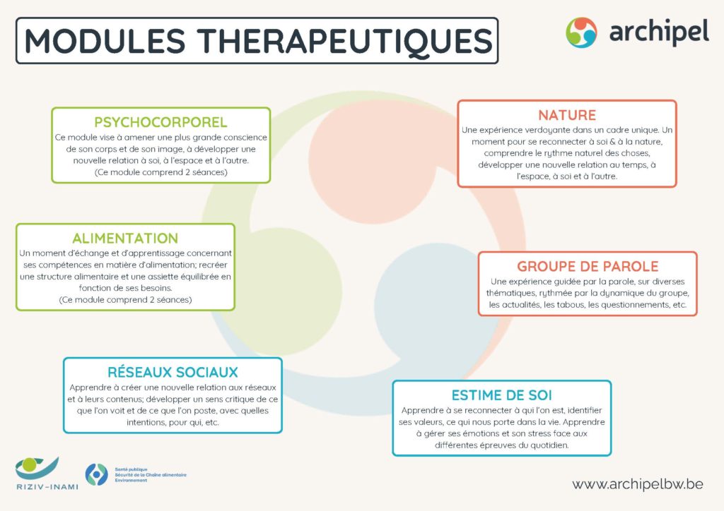 Ce projet de thérapie à temps partiel est proposé sous deux formes pouvant se faire simultanément, à travers des modules thérapeutiques et/ou de la thérapie multifamiliale.